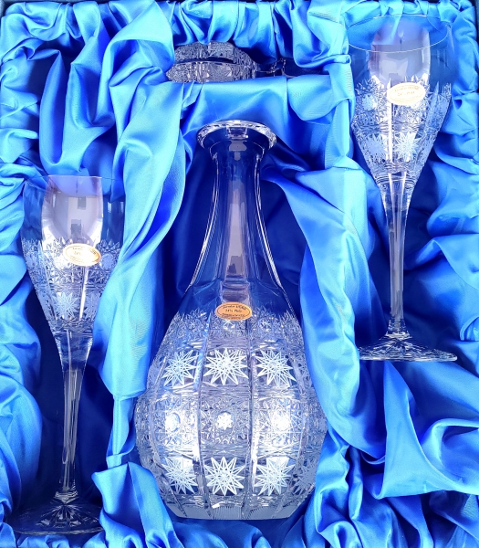 Luxusní set na víno z pravého českého křišťálu min. 24% PbO. Sada obsahuje karafu na víno o objemu 1 l a dvě skleničky o objemu 270 ml. Baleno v modrém saténu.